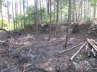 | 5郭内部。奥に土塁が見える。 | 1郭との間の堀切。深さ10mほどもあり、鋭く、とても登れない。 |