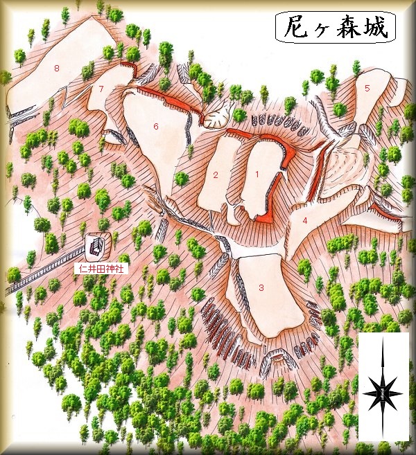 | 尼ケ森城は、安芸氏の家臣であった黒岩越前守の城であった言われているが、詳しいことは分からない。 永禄年間には長宗我部氏の持ち城となり、家臣の吉田重俊が入城した。この頃に長宗我部氏の拠点城郭として大規模な改修が行われているのではないかと考えられる。 |