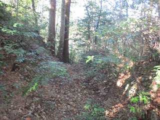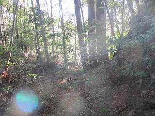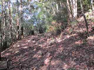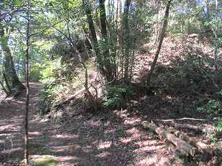 | 登城道入口。 | 登城道を登って行くと、墓地を経て堀切の所に至る。 |