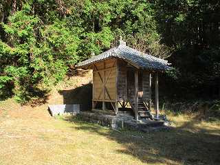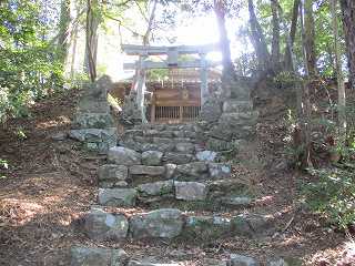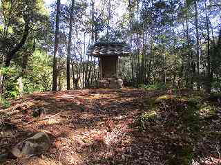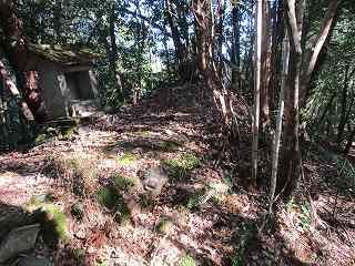 ジグザグに登って行くと、やがて祠の祭られているテラス状の郭に着く。この辺りからが城域であろう。一段登った所に放棄された墓地のある腰曲輪状の平場が見られる。
