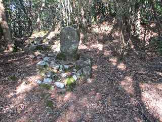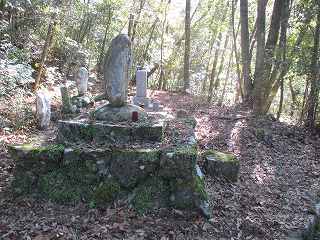 下の墓地から上に進んで行くと、何段もの小規模な削平地が連続し、そこに古い墓が建てられている。この山稜は、かなり古い時代の墓域だったようだ。ただ、そのほとんどは現在では打ち捨てられてしまっている。
