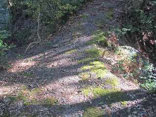| 登城道入口。 | 入ってすぐに道が2つに分かれるが、左側の石積みの間の通路を抜けていくのが登城道。 |
