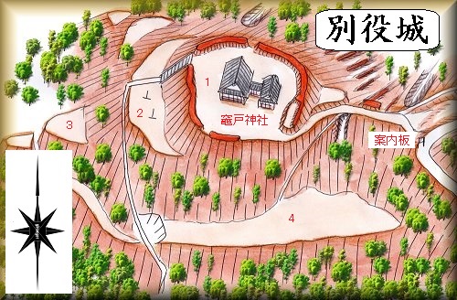 別役城は、竈神社の祭られている比高30mほどの山稜先端部に築かれている。というわけで竈神社を目指して行けばよい。
