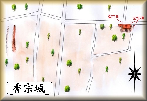 | 香宗城は、土佐の名族であった香宗我部氏の居城であった。 香宗我部氏の先祖は、建久4年(1193)に宗我部・深淵両郷の地頭として入部した中原秋家である。 中原氏は香宗我部氏を名乗り、その後400年にわたり、この地域を支配することになる。 大永6年(1526)、香宗我部親秀は安芸氏との戦いで敗れ、嫡子秀義が戦死してしまった。 その後、長宗我部氏の勢力が大きくなってくると、長宗我部国親の3男親泰を養子として迎えて、長宗我部氏に所属するようになっていく。 長宗我部氏が安芸氏を滅ぼした後、香宗我部親泰は安芸城主となった。親泰は、その後阿波国進出の際の司令官として活躍することになる。 文禄・慶長の役では、親泰の嫡男親氏が出陣したが戦死してしまった。これにより代わって親泰が出陣することとなったが、親泰も長門国で病死してしまう。そこで親氏の子親和が幼少の身で家督を継ぐことになった。 慶長6年(1601)、関ケ原合戦後の仕置きで長宗我部盛親が改易となると親和も所領を失った。 親和は、後に肥前国唐津の寺沢氏に仕官し、名跡だけは受け継がれていった。 |