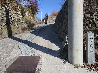 城址への入口はこの場所にあり、脇には光国城の入口を示す城址碑が建てられている。近くに路肩の広くなっているところがあるので、車はそこに停めておくことができる。