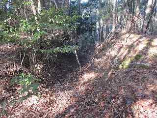 神社の背後に回り込んでみると、そこに堀切が掘られていた。そこで堀底に降りて尾根基部側に進んで行く。堀切は合計4本(半分だけのものも含めると5本)あり、尾根基部との間の分断を図っている。