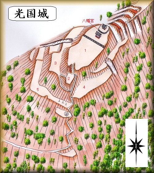 光国城は、それなりに遺構の充実した山城であるが、1郭がヤブ化してしまっているのがちょっと残念である。拠点城郭というほどの規模ではないが、それなりによくまとまった遺構が見られる山城である。
