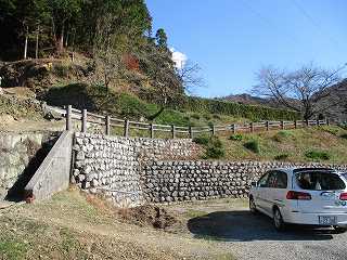 | 西側の橋のたもとに山川城の案内板が立てられている。正面奥の山が城跡。ここからの比高は70mほど。 | 公園入口の駐車場。右側の柵に沿って進んで行く。 |