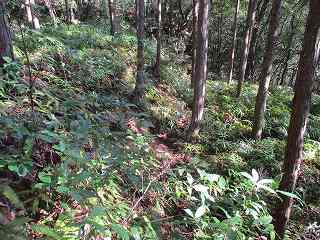 後はテキトーなところから直登していく。下のお宅から上の墓地に上がって行く道が見えているが、その道の途中から1郭へと通じる道が付けられている。といっても、これは降りる時になって気が付いたことであり、登って行く際に、この登り口を発見するのはかなり困難であろう。
