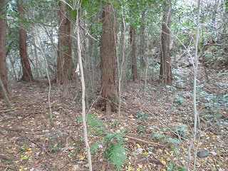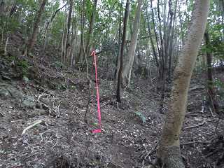 車を置いて東側の山稜方向に入り込んでいくと、山道のようなものが付けられている。それを進んで行くと、右手の斜面の上に赤いテープが巻かれているのに気が付いた。