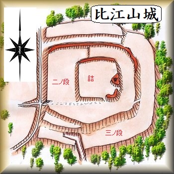 さて、比江山城であるが、永源寺の東側にある比高20mほどの台地先端部に築かれている。城内の土塁上には比江神社が祭られており、南側の山麓には紀貫之が建立したと言われる日吉神社が建立されている。