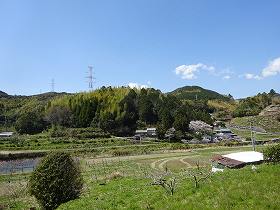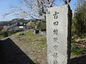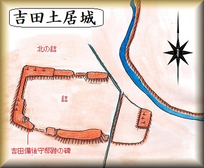 吉田土居城は、吉田地区の集落の北側にあり、地図にも「吉田備後守邸跡」を記載されているので、大体の位置はよく分かる。近くまで行くと、こんもりとした森が見えてくるので、それを目当てにしていけば間違いない。
