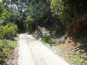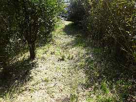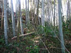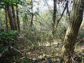 | 詰の内部。ヤブだらけである。 | 下の腰曲輪から詰に続いている切通し。近代のもののようである。 |
