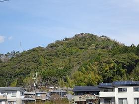 | 東側から遠望する亀岩城。比高40mほどである。鉄塔が目印になる。 | 亀岩城への道。右手の未舗装の道を上がっていく。四駆なら登って行けるが、普通車はやめた方が無難である。 |