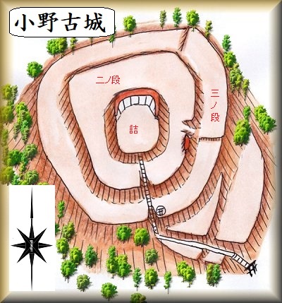 小野古城は、南北朝時代に小野彦衛門によって築かれた城だと言われているので、やはり古い城郭である。小野氏は北朝方に属し、南朝の勢力と戦った。