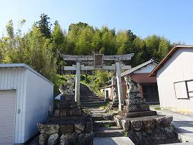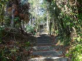 | 神社参道入口。ここからの比高は30mほど。 | 詰の段へと続く石段。 |
