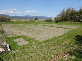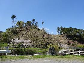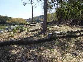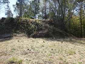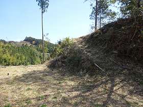 | 南側から城内を見たところ。 | 南側の土塁。かなり大きなものである。墓地が撤去されたようで、残骸が散らばっている。 |
