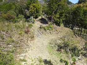 まず、鉄塔のある3郭を見てみようと思ったので、左手の上の道に回り込んでいく。この道はもともとは帯曲輪であったものを利用しているようである。しかし、これを進んでも、3郭に登って行く道はなさそうだったので、途中から上に登って行くことにする。するとすぐに2郭と3郭との間の堀切の所に出た。この堀切の脇から3郭内部に入っていく道があったので3郭に進んでいく。