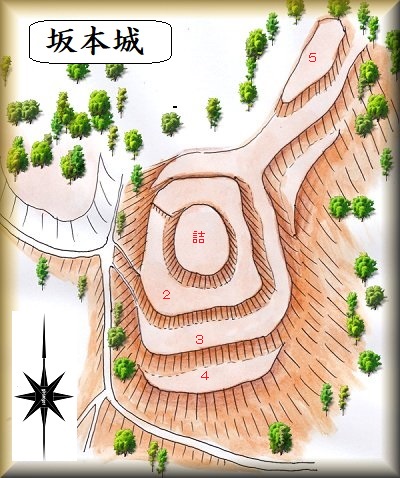 坂本城は、詰の段を中心として数段の腰曲輪を形成しただけの単純な構造の城郭である。比較的古い時代の山城の様相をそのまま残しているような城である。
