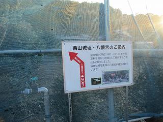 城址の北側の県道14号線を走っていると、道路脇に「栗山城址・八幡宮」の案内板が見えてくる。この場所である。ここから南側に進んで行くと、山稜に突き当たる箇所に空き地があった。地元の方にお願いしてここに車を停めさせていただいて、登城口を伺った。