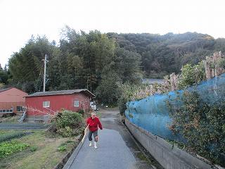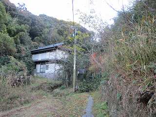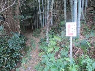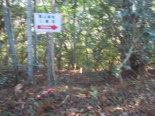 ここから左側(東側)に進んで、一番奥の家の所から登るのだという。そこで東側に進んで行く。すると、奥の家の所で道は行き止まりになってしまった。「あれっ」と思ったのだが、奥の民家の脇を抜けていくと、その先に登城口の案内が見えてきた。これは知らないと分かりにくい。