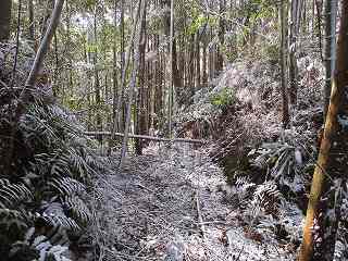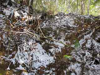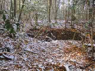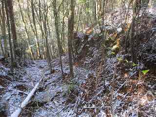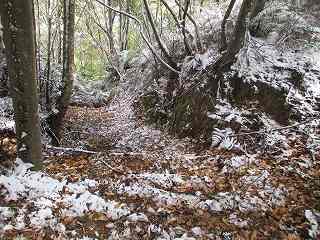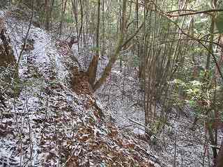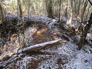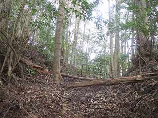 | 3郭へ向かう尾根は傾斜地形となっている。 | 1郭手前の堀と土橋。 |