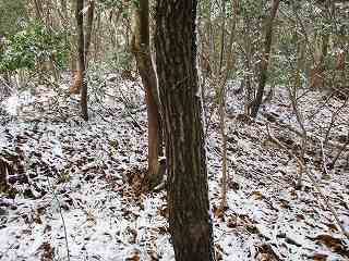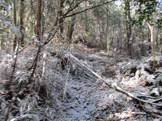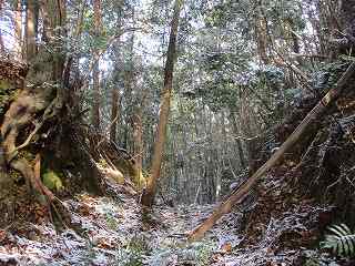道はないが、なんとか斜面を直登していく。雪で濡れているため、ヤブの中を登って行くと、だんだん濡れてきてしまう。木に掴まるたびに上から水滴が落ちてきてしまうのである。かといって、木に掴まらなかったら、とても急斜面をよじ登って行くことはできないので、濡れるのを覚悟して登って行く。