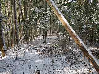 3郭の南側の尾根も堀切によって区画されていたようだが、こちらは後世の作業道によって埋められてしまっている。ただし、側面部に竪堀が明確に残されているので、ここが堀切であったことは確認できる。