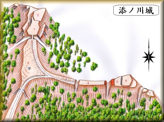| 添ノ川城の城主は、依岡氏であり、依岡左京、右京、弥次郎らといった名前が伝えられている。依岡氏は一条氏の重臣で、渡川の合戦にも参加している。 天正14年(1586)の戸次川の戦いで長宗我部信親と共に戦死した武将の中に依岡右京進の名前があることから、依岡氏は一条氏没落後は長宗我部氏の家臣となって、添ノ川城を維持していたのではないかと考えられる。 |