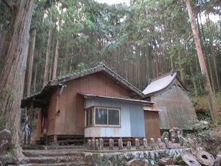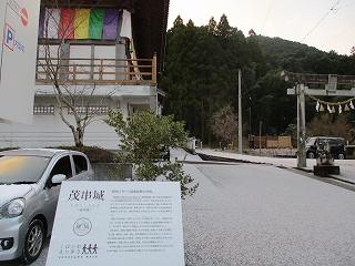 | 三熊野神社入口にある案内板。この奥の比高160mの山稜が城址。 | 北側山麓にある三熊野神社。 |