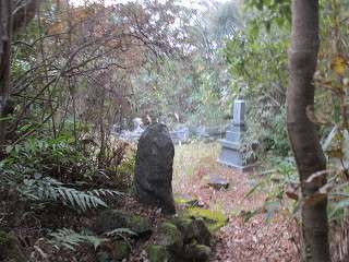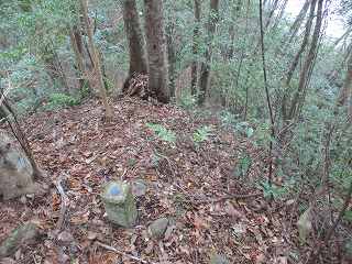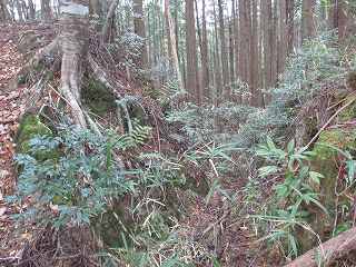山道を登って行くと段々の平場があり、そこに古い墓地が造成されている。この辺りは郭としては造作が甘い感じがするので、墓地として後世に造成されたものである可能性が高い場所である。