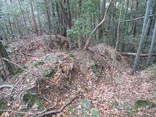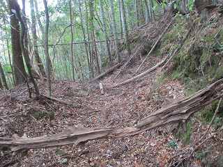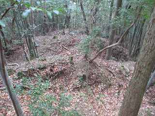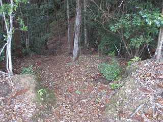 | 八幡城に続く段郭群。 | 八幡城手前の堀切。 |