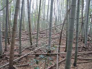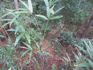 | 尾根を進んで行った先が向城。向城の入口。 | 向城内部。笹薮になっているが、右側に土塁が、背後に堀切がある。 |