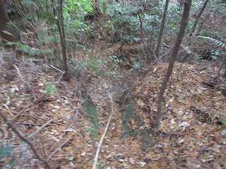 | ここからは尾根続きに兼松城へ。西側の二重堀切のうち外側の堀切。 | 兼松城二重堀切の外側の堀切から落ちる竪堀。 |
