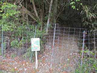 登城口はあちこちにあるようだが、私は向城の下の尾根にある鉄塔管理用の道路から入って布城を目指し、後は支城群を歩きながら、一番東端にある郷ノ城から降りてみることにした。向城の下の鉄塔管理道路入口はこの場所にあり、獣除けの柵を開けて入って行く。