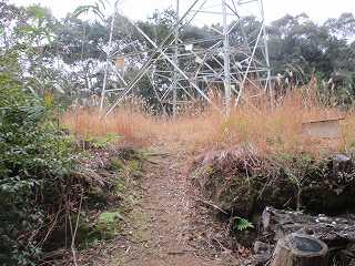 | 最初の鉄塔。遺構かどうか分からないが、前後に帯曲輪が付けられ、虎口状の切れが見られる。 | 鉄塔背後の切れと帯曲輪。 |