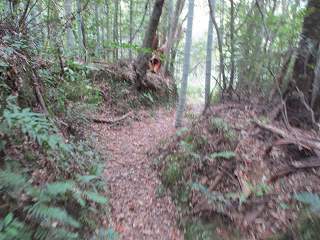 山道を進んで行くと東側の堀切が見えてくる。さらに進んで行くと西側の堀切が見えてきたので、この間の部分が城域であることが分かる。