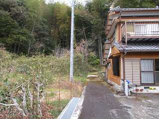 | 向城の先端部。鉄塔が建てられており、鉄塔管理用の道が付けられている。 | 墓地の脇にある鉄塔管理道路入口。柵を開けて入って行く。 |