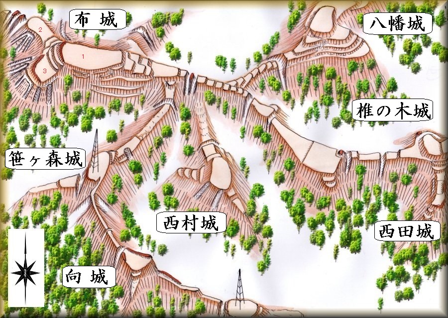 布城jは、戸内集落の背後にそびえる広大な山稜全域を取り込んだ巨大城郭である。それぞれの尾根にある遺構に城郭名が付けられ、合計10もの城郭が存在していたことになる。それらはすべて布城の支城に当たるものであり、同じ山稜内にこれだけの城が築かれている例も珍しいであろう。
