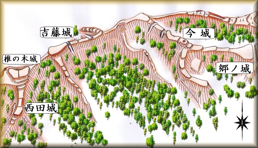 吉藤城から南東側に尾根を進んで行った所に堀切で区画された平場があり、ここが今城。更に今城から降って行った一番山麓の集落に近いところにある平場が郷ノ城ということらしい。郷ノ城は、その名称の通り、最も郷に近いことを示す名称なのだろう。