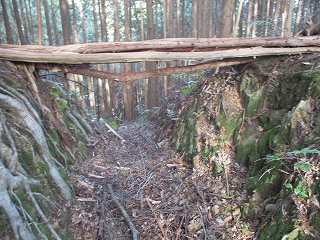 | 郷ノ城へ。最も山麓に近いことから、このように呼ばれているのだろうか。虎口。 | 切通し通路。 |