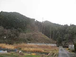 | 北西から見る平田城。比高30mほどの独立丘陵である。 | 北東山麓にある空き地の奥に鉄塔の管理道路がある。 |