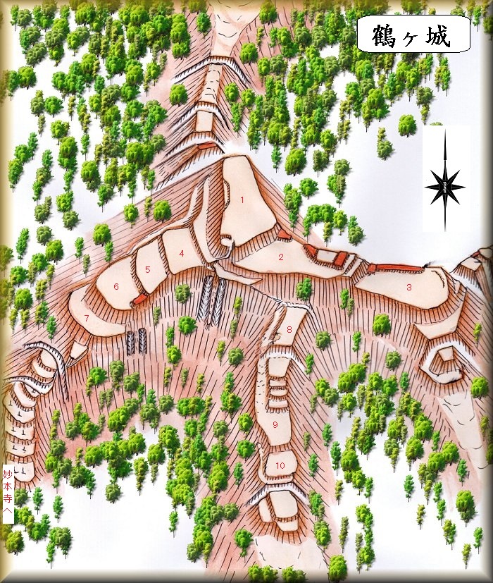 鶴ヶ城の山麓に妙本寺という無住の寺院がある。この寺院の背後の山稜が城址となっているので、妙本寺を探していけばよい。妙本寺はこの場所にある。集落背後の一番高い場所である。車も妙本寺の境内に停めておくことができる。