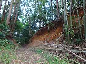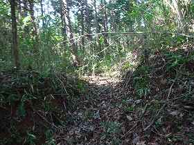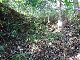 この大堀切は、えぐられたように削られており、後世、道幅を広げるために改変されているように思われる。