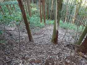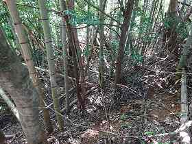 2郭の下には横堀状になっている部分がある。刮目すべきなのは、その下の北側の斜面に畝状竪堀があるということである。このような規模の大きくない城に畝状竪堀があるというのも意外な話だが、確かに何本かあるのが確認できる。