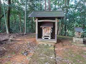 | 北側の斜面には畝状竪堀が何本か見られる。 | 1郭に祭られている秋葉神社。 |
