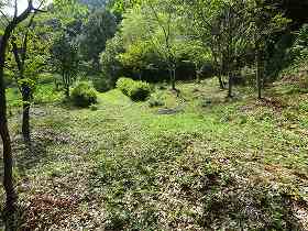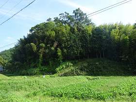 | 南側のお地蔵様の所から遠望する有岡若宮城。ここからの比高は10mほど。この道をまっすぐ進むと民家の脇を通って堀切の所に出る。 | 1郭の堀切だが、後世に削られて広げられているようだ。 |