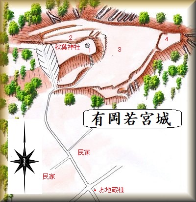 有岡若宮城は、有岡集落の北側にそびえている比高20mほどの山稜に築かれており、主郭には秋葉神社が祭られている。したがって、この神社を目指していけばよいのだが、この参道がけっこう分かりにくい。