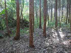 | 南側から遠望する嶋間城。正面下の墓地の辺りから登れる。 | 登り始めるとすぐに竪堀が見えてくる。 |