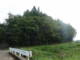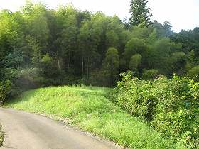 | 東側から城址を見る。円応寺の背後の比高20mほどの山稜である。 | 道はなさそうだったので、この辺りから進入を試みる。 |